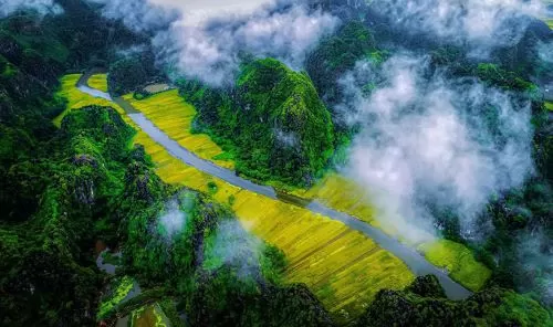 ニンビンには見どころがたくさんあります。ゴドン川沿いのボートに乗って、黄金色の棚田と雄大な山々を背景に眺めましょう。秋のドライブでは、山々に囲まれた歴史的なビックドンパゴダを訪れ、ムア洞窟の500段の階段を登ってムア山の頂上まで行き、高所からニンビンの雄大な自然を自分の目で見ることができます。