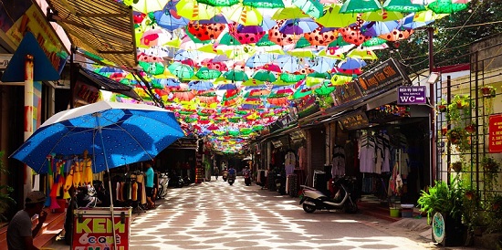 カラフルな傘による目を引くユニークな装飾が印象的なシーンを作り出し、訪問者がここを訪れた際に美しい写真を自由にチェックすることができます