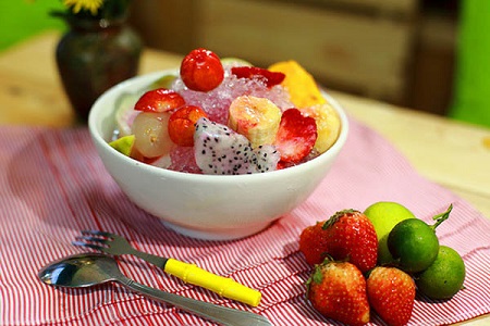 ホア・クア・ダム(フレッシュフルーツとクラッシュアイスのミックス)では、イチゴ、アボカド、ブドウ、リュウガン、ライチ、マンゴー、ジャックフルーツ、ドラゴンフルーツ、パパイヤ、グアバ、スイカなど、さまざまなバリエーションのミックスフルーツを提供しています。ホア・クア・ダム・トゥ・ティッチのミックスフルーツの各グラスは、新鮮な風味と目を引く色をしています。